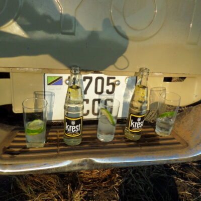 Ik ga verder: ‘En dan de mooiste traditie: de sundowner. Aan het eind van de middag, als de zon ondergaat, stop je soms voor een drankje midden in de bush. Gin & tonic is de klassieker. Ooit omdat de tonic met kinine hielp tegen malaria, nu vooral omdat het heerlijk smaakt bij een eindeloze horizon en een oranje gekleurde lucht. Maar een biertje of een frisdrank smaken natuurlijk ook goed.’