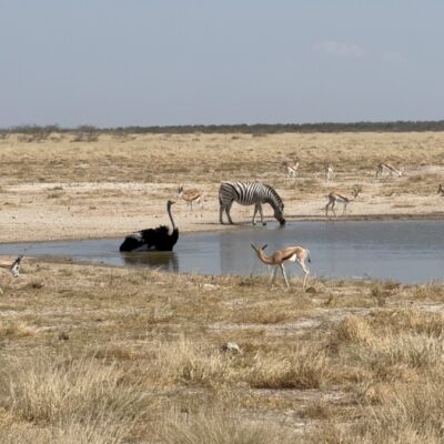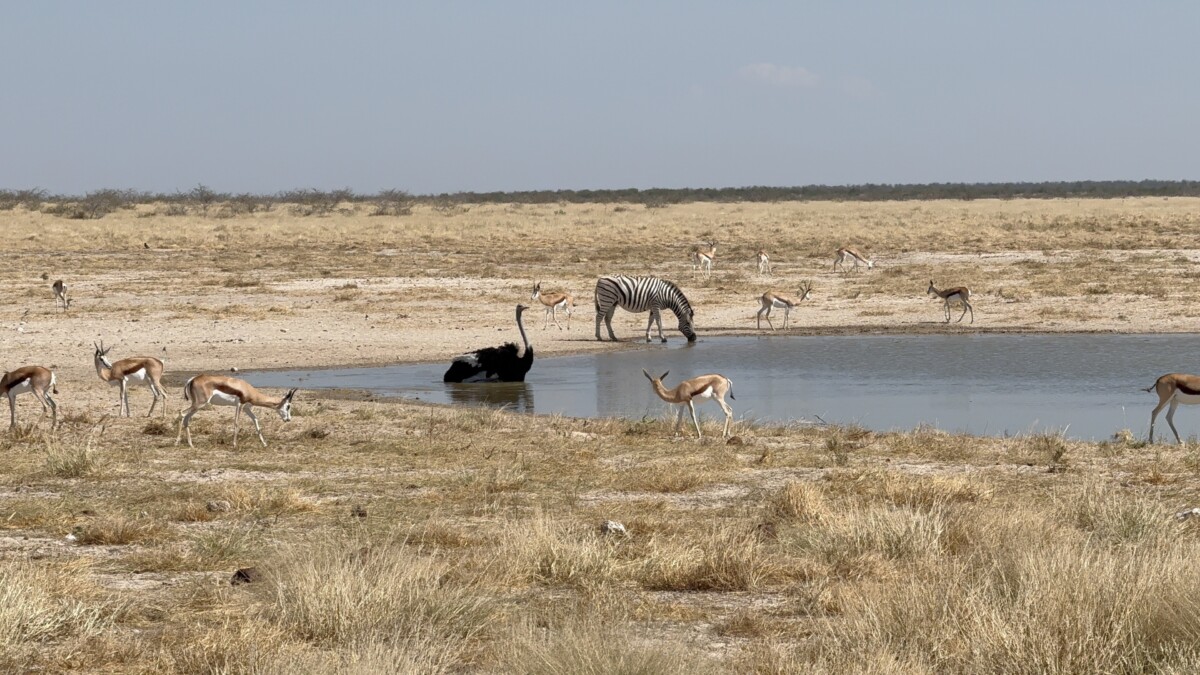 ‘Een waterhole is een drinkplaats waar dieren samenkomen,’ antwoord ik. ‘Soms een kudde zebra’s, soms een olifantenfamilie en soms een leeuw die geduldig wacht. Voor de dieren is het een noodzaak om daarnaartoe te gaan, voor ons is het een plek waar de hele savanne samenkomt: van dorstige zebra’s tot jagende leeuwen.’